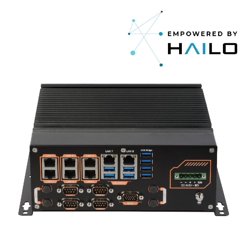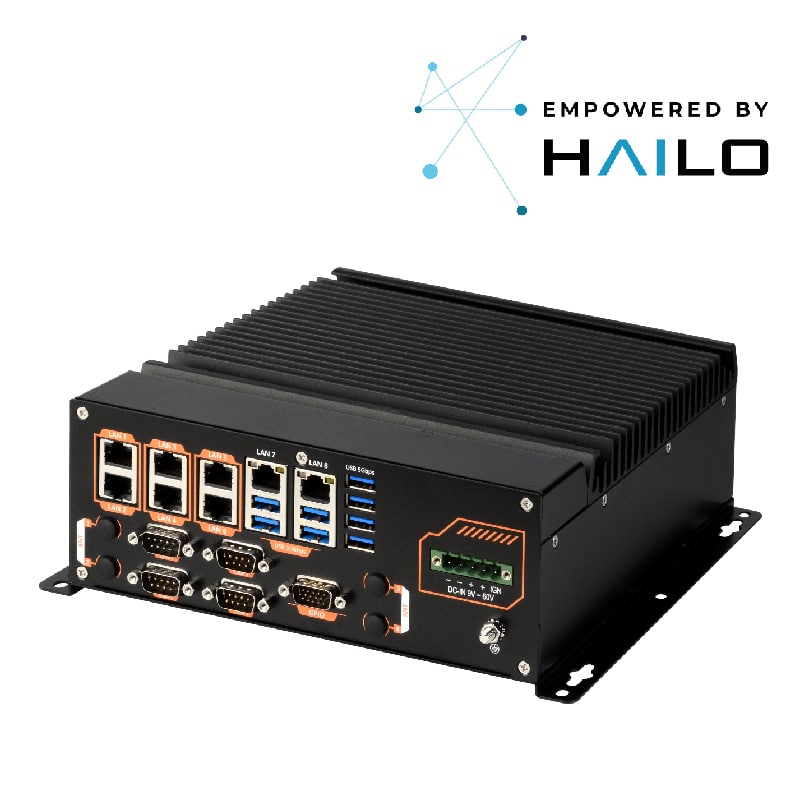 The ABOX-5211(P) Series is powered by the 10th Gen Intel® Core™ i9-10900TE processor and boasts 8 x DI, 4 x DO, and 4 x RS-232/422/485 support. It is perfect for Industrial loT deployments, with high-performance computing and real-time capabilities certified by Intel® ESDQ (Edge Software Device Qualification) for Autonomous Mobile Robots (AMR). The Intel® UHD Graphics 630 Graphics and single-side I/O panel design, along with 9~60VDC power input, make it ideal for Factory Automation, Service Robots, Cellular V2X, Smart Retail, and any AloT/Industry 4.0 applications. Moreover, it is suitable for industrial automation, digital signage, outdoor video surveillance, and AGV/AMR. In addition, ABOX-5211(P) Series accelerates AI inferencing for Edge Computing applications by equipping up to two Hailo-8™ AI Accelerators, and a single Hailo-8™ AI Accelerator offers 26 TOPS inference performance.